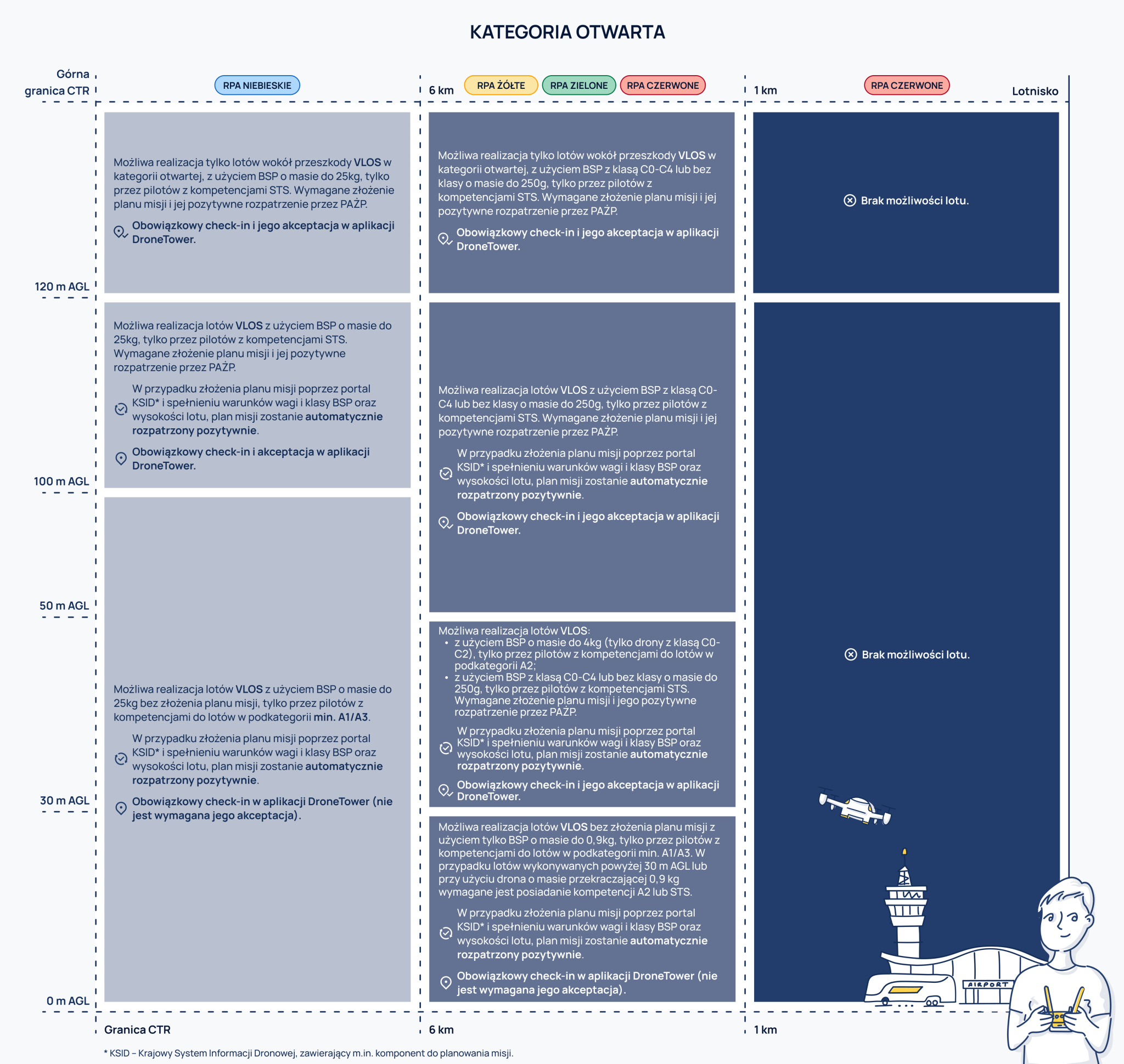 - niezależnie od wagi BSP powyżej 30 m wysokości: należy zgłosić z wyprzedzeniem plan misji (KSID), uzyskać akceptację misji, a następnie zgodę TWR przed lotem (maksymalnie do 50 m na zasadach A2 w kategorii otwartej lub w kategorii szczególnej, powyżej 50 m tylko w kategorii szczególnej) loty możliwe za zgodą zarządzającego;